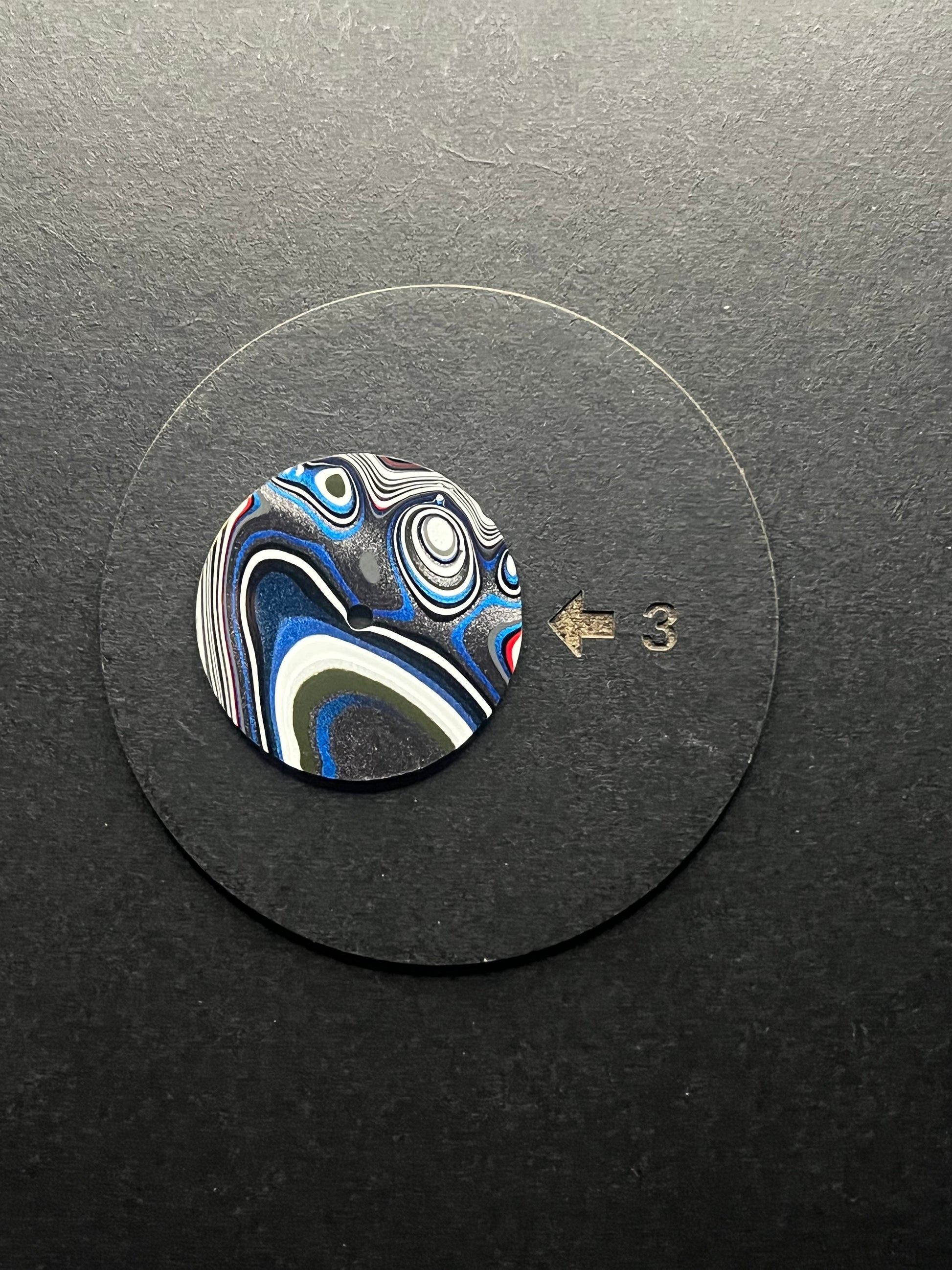 This fordite dial is ready to be installed on an NH movement. It has a brass back with feet. It is 28.5mm in diameter and 0.4mm thick with a 2mm center hole. This dial is hand made by me and painstakingly polished to an ultra fine polish results in a shocking luster and detailed texture unlike any other. Build or mod your own watch or have me build a watch for you! Fordite or Detroit Agate is indutrial waste from the paint area from a car factory, when the sprayers miss the car the paint lands on equipment after some time many layers build up and someone has to dispose of the preciouse material we love so much. Instead of throwing it away it gets made into gems, knife handles, shift knobs and in my case watch dials. the final thickness of the fordite for my dials is typically 0.2 mm, it is extremely difficult and time consuming to achieve this evenly and get a high luster polish too. *Made in Colorado USA.*